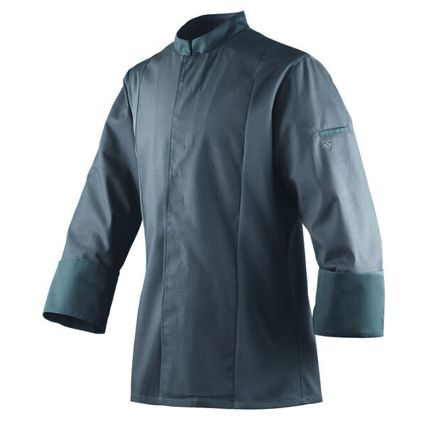 Veste bi-matières mixte à col officier, doublée en éponge. Veste en nid d’abeille. Devant fermé par boutons-pression cachés. Découpes côtés en maille respirante. Manches longues. Poche stylo sur manche gauche. Fentes bas découpes dos. Coupe ajustée.