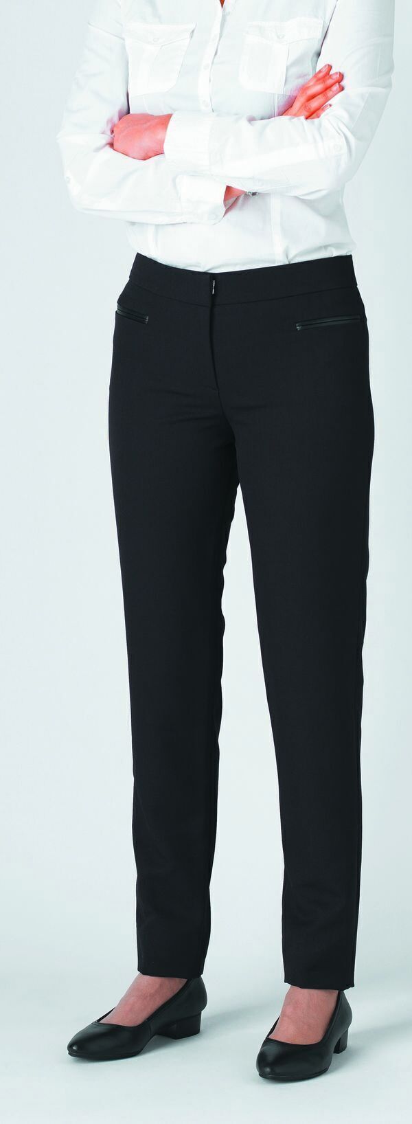 Pantalon de service femme. Ceinture avec fermeture à glissière centrale, bouton cousu et agrafe invisible. 2 poches italiennes finition effet cuir. Pinces dos. Finition bas surfilé. Coupe slim. E.J. : 82 cm