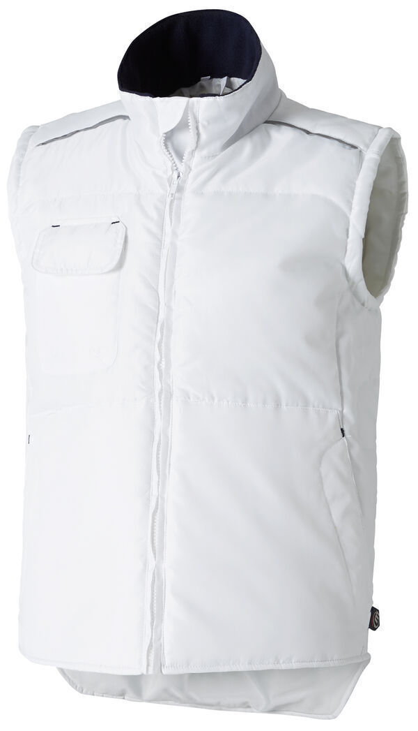 Gilet col montant doublé en polaire. Fermeture à glissière. Empiècement sur les épaules avec passepoil rétroréfléchissant. Poche portable. Poche portefeuille. 2 poches basses. Dos protège reins.