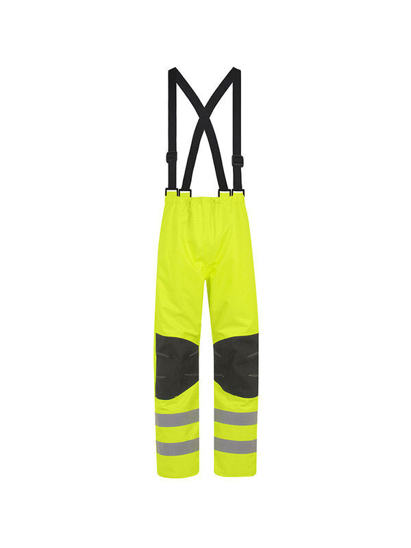 Pantalon doublé. 2 bretelles élastiques, réglables et amovibles par boucles et auto-agrippant. Taille élastiquée. Triangle d’aisance au niveau de l’entrejambe. 2 passe-mains fermés par 2 auto-agrippant non feu et bouton-pression. Renforts genoux avec pinces d’aisance (surpiquées fil non feu) et gouttière au bas du renfort pour l’évacuation de l’eau. Soufflet d’aisance au bas de chaque jambe fermé par 3 auto-agrippant. 2 bandes rétroréfléchissantes microbilles RETHIOTEX® 29 500 de 5 cm cousues. | Mercerie tout plastique. Coutures étanchées.