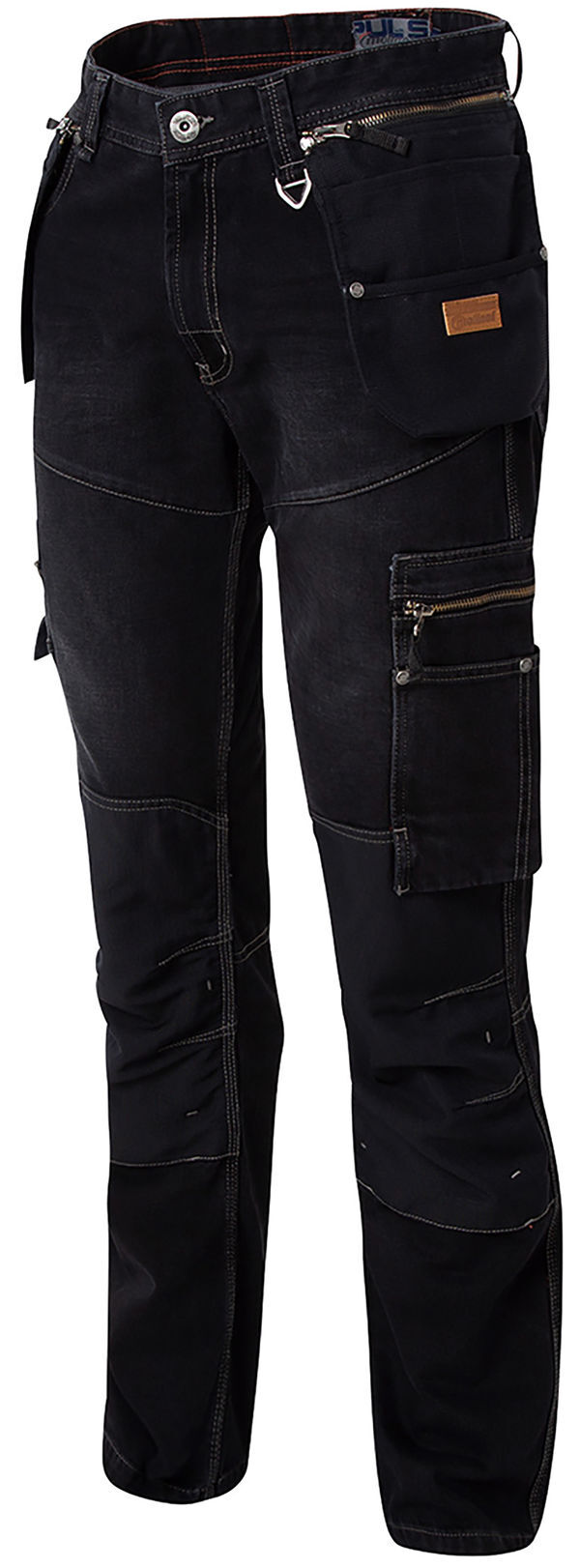 Jean poches holster. Braguette zippée. Ceinture 5 passants dont un double milieu dos. Rehausse dos. Poches porte-outils amovibles par zip. Poche ticket, 2 poches cavalières, 2 doubles poches côtés avec zip, compartiments pour smartphone avec rabat pressionné, 2 poches dos. Sangle côté accroche marteau. Poches genouillères avec renforts Polyamide et système de réglage (2 niveaux, plaques certifiées EN14404 REF.GN08). Triple surpiqûres. Points d’arrêts renforcés. Coupe ajustée. E.J. : 82cm