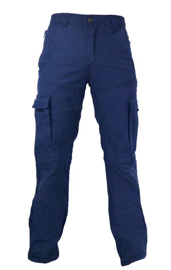 Pantalon stretch, ceinture droite avec passants. Fermeture centrale par bouton. Braguette zippée. Renfort à l'entrejambe. 2 poches italienne. 2 poches cuisses à rabat et soufflet contrastés, dont une poche de sécurité fermé par zip. Poche téléphone. Réhausse dos. 2 poches plaquées dos dont une à rabat. Finition par ourlets. Coupe ajustée, E.J: 82 cm (+5 cm).