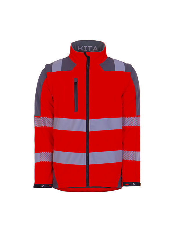 Softshell haute visibilité 3 couches. Fermeture par glissière jusqu’en haut du col avec mentonnière. Curseur réversible pour fixation à la parka KITA®. 2 poches basses, poche poitrine fermée par glissière, 2 poches intérieures fermées par auto-agrippant. Dos couvre-reins. Manches préformées et amovibles par glissière. Blouson relevé de 2 ceintures, 2 brassards et demi-bretelles rétroréfléchissantes segmentées.