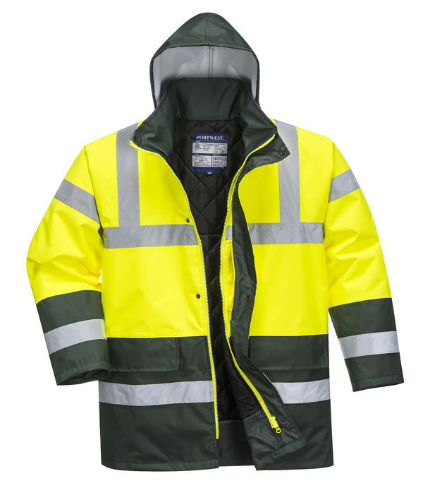 Parka haute visibilité imperméable et matelassée. Capuche cachée dans le col. Fermeture à glissière double curseur, sous rabat à boutons-pression. 2 poches basses à rabat. Poche Napoléon. Poche intérieure. Poignets coupe-vent en tricot.
