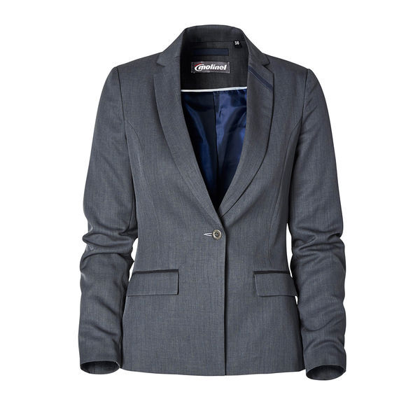 Veste femme. Col tailleur avec galon contrasté sur revers gauche. Découpes princesse. Fermeture centrale 1 bouton avec finition fil bleu glacier sur la boutonnière. 2 poches basses passepoilées avec rabat (passepoil contrasté), poches intérieures. Fente au dos.