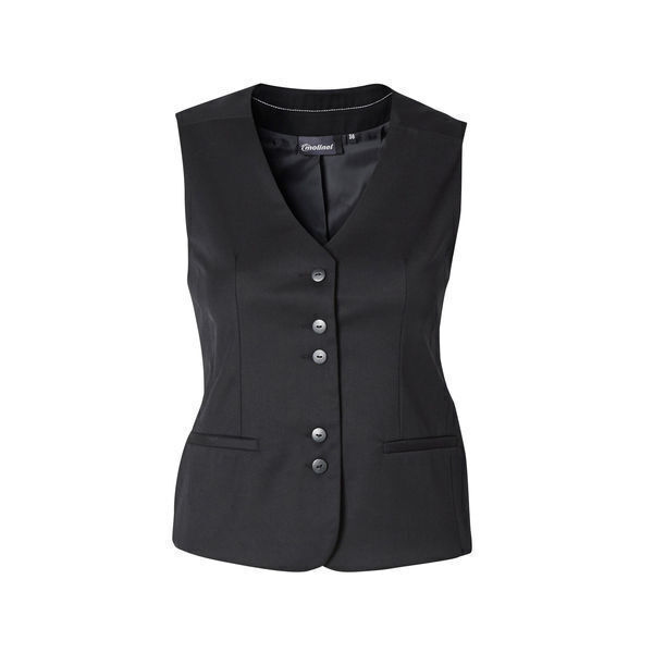 Gilet de service femme encolure V. Fermeture 5 boutons milieu devant. Pinces poitrine. 2 poches basses passepoilées, 1 poche intérieure. Découpes et patte de serrage par double anneau au dos. Bas arrondi.