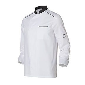 Veste homme à col officier contrasté. Fermeture devant asymétrique par pressions cachées. Poche poitrine passepoilée. Manches longues, poignets rapportés. Poche stylo plaquée sur manche gauche. Fentes côtés. Empiècements sous bras et dos en maille respirante. Passepoil contrasté aux épaules devant et dos, bas de poche stylo. Coupe regular. Maille double face alvéolée antibactérienne.