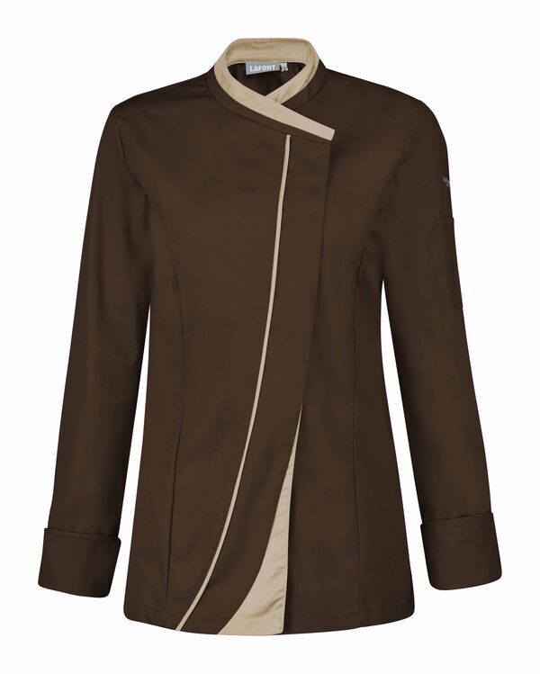 Veste femme à effet double col. Fermeture croisée par grippers cachés, double empiècement milieu dont angle bas contrasté et biais contrasté sur toute la hauteur. Découpes princesse sur devant et dos. Fentes côtés renforcées par un twill jacquard. OEillets d'aération brodés sous bras. Manches longues, poignets rapportés avec détails contrastés. Bas de manches à revers. Coupe ajustée.