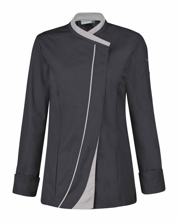 Veste femme à effet double col. Fermeture croisée par grippers cachés, double empiècement milieu dont angle bas contrasté et biais contrasté sur toute la hauteur. Découpes princesse sur devant et dos. Fentes côtés renforcées par un twill jacquard. OEillets d'aération brodés sous bras. Manches longues, poignets rapportés avec détails contrastés. Bas de manches à revers. Coupe ajustée.