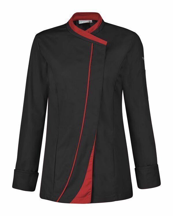 Veste femme à effet double col. Fermeture croisée par grippers cachés, double empiècement milieu dont angle bas contrasté et biais contrasté sur toute la hauteur. Découpes princesse sur devant et dos. Fentes côtés renforcées par un twill jacquard. OEillets d'aération brodés sous bras. Manches longues, poignets rapportés avec détails contrastés. Bas de manches à revers. Coupe ajustée.