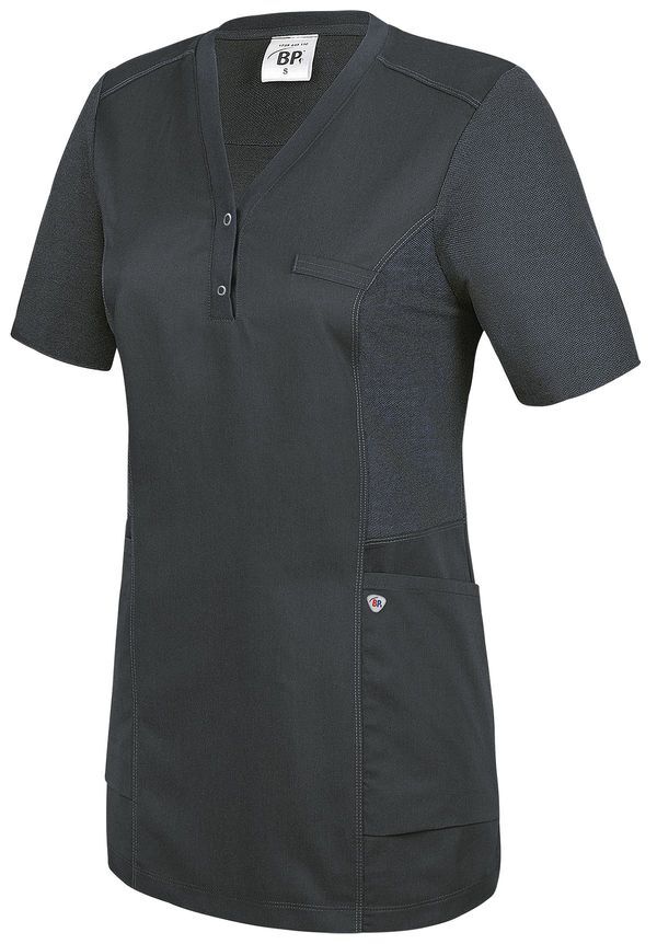 Tunique bi-matière à enfiler coupe femme. Encolure en V avec patte de boutonnage 2 boutons-pression. Empiècements en piqué extensibles sous les aisselles, 2 grandes poches latérales dont 1 avec poche pour bip, passant pour badge. Coupe ajustée. Manches courtes. Longueur : 68 cm.