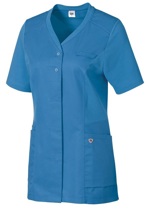 Tunique bi-matière coupe femme. Encolure en V. Fermeture par patte à boutons-pression dissimulée, dont 2 boutons-pression visibles. Empiècements en piqué, 2 grandes poches latérales dont 1 avec poche pour bip, passant pour badge. Manches courtes. Longueur : 68 cm.