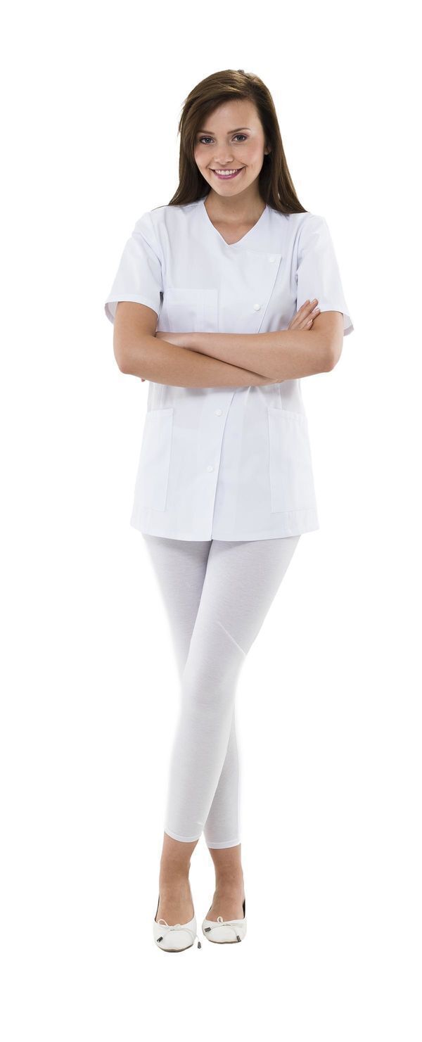 Tunique femme. Encolure V. Fermeture asymétrique par boutons-pression contrastées. Poche poitrine avec compartiment stylo, 2 poches basses. Manches courtes. Longueur : 75 cm.