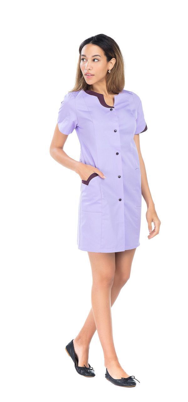 Tunique femme ajustée. Fermeture milieu devant par pressions. 2 poches basses. 2 poches BIP. Manches courtes. 2 fentes dos. Coupe ajustée. Longueur : 85 cm.