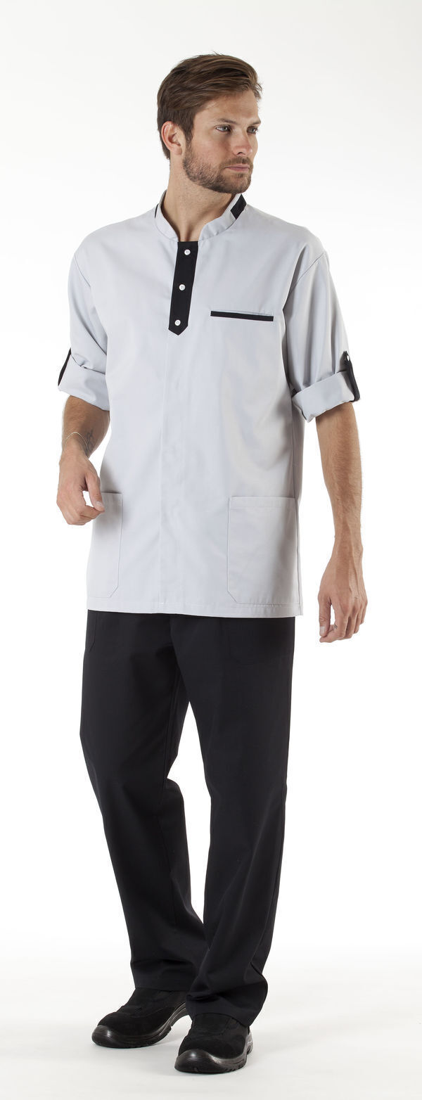 Tunique homme. Col officier fantaisie avec patte contrastée. Fermeture centrale par 6 pressions, dont 3 imitations boutons sur patte. Poche poitrine avec passepoil contrasté, 2 poches basses plaquées. Manches transformables avec pattes contrastées. Longueur : 80 cm.