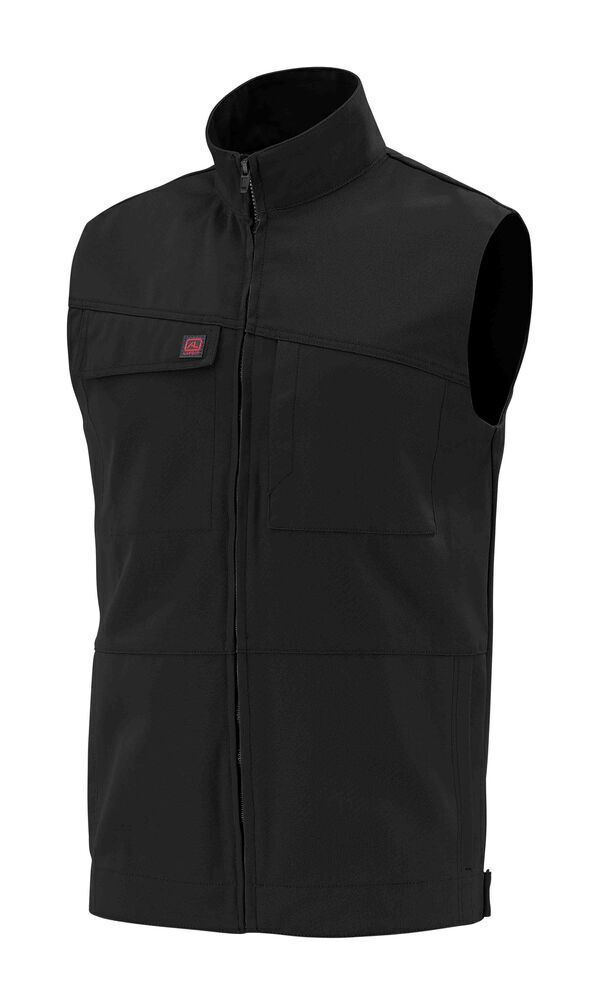 Gilet, col montant. Fermeture milieu devant par zip. 2 poches poitrines : droite incrustée sous rabat fermé par Velcro® cachés, gauche avec ouverture verticale fermée par Velcro® caché. 2 poches basses verticales. Découpes asymétrique devant et dos. Ceinture droite avec pattes de serrage réglable par pressions cachées. Sans manches avec enformes emmanchures. Mercerie tout plastique.