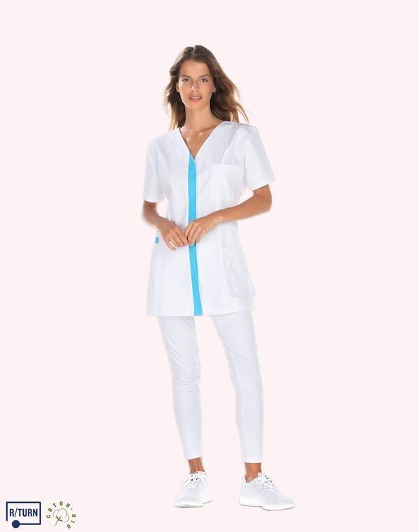 Tunique encolure V. Fermeture milieu devant par boutons-pression, parement contrasté. Découpe de cintrage. Poche poitrine, poche BIP. 2 poches basses semi-volantes. 2 fentes dos. Longueur : 75 cm.