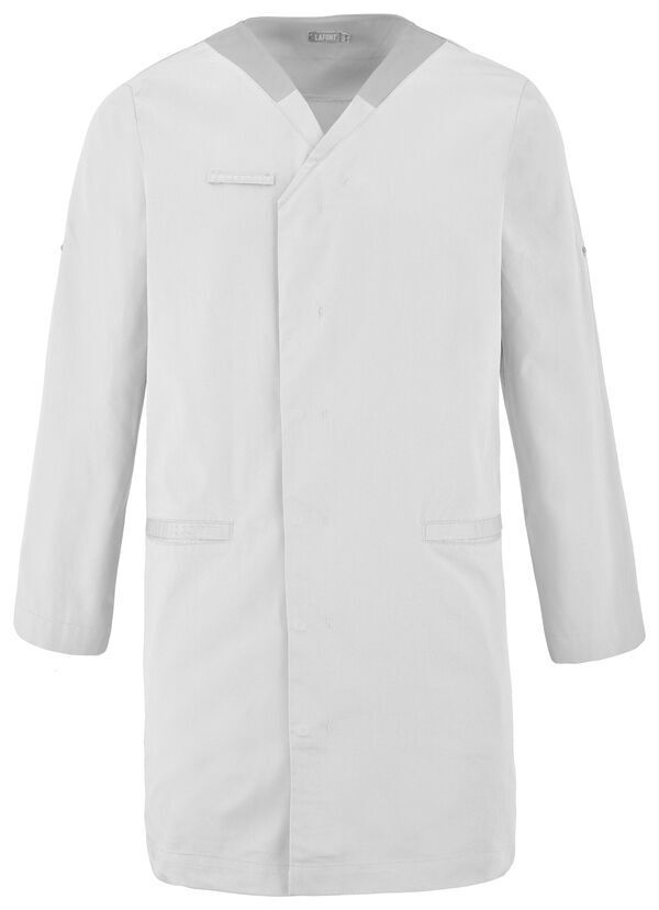 Blouse . Encolure V contrastée, collerette de marquage intérieur. Fermeture croisée par grippers cachés. 2 poches basses passepoilées. Passant porte-badge. Manches transformables. Longueur : 100 cm.