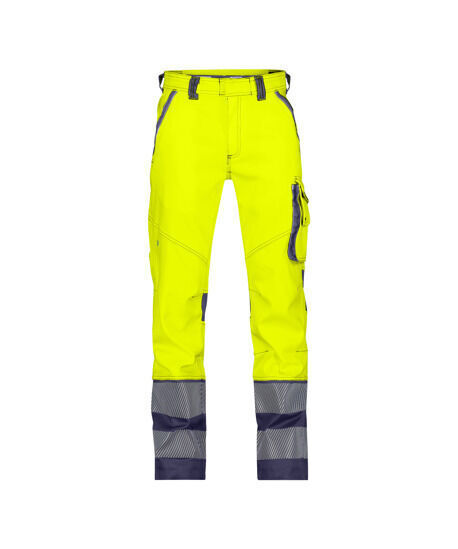 Pantalon stretch classe 2. Ceinture fermeture à glissière et bouton jeans caché, réglable au dos par élastique. 6 passants. 2 poches italiennes. Poche cuisse. Porte-crayon, poche mètre, poche cutter, poche téléphone et boucle pour porte-badge. Poches arrières plaquées dont 1 avec rabat. Poche de sécurité cachée avec fermeture à glissière. Coutures triples. Bandes réfléchissantes segmentées de 80 mm. Coupe ajustée.