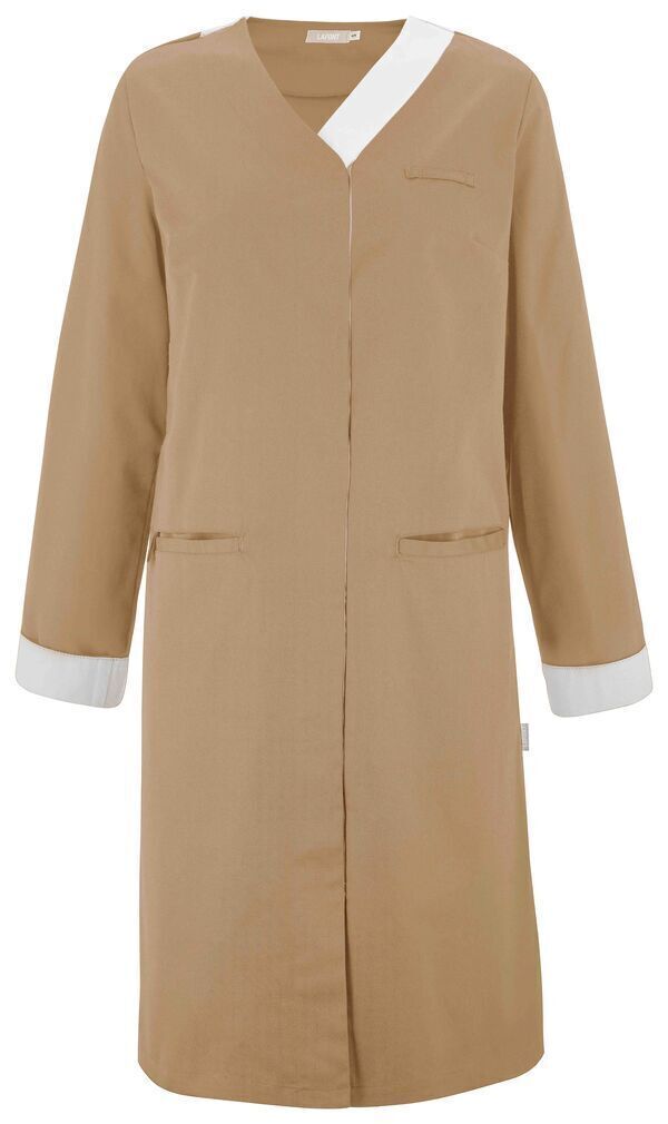 Blouse femme. Fermeture milieu devant par boutons-pression cachés. Passant porte-badge côté gauche, 2 poches passepoilées dont une à 3 compartiments et un passant pendoir côté. Oeillets d'aération brodés sous les bras, manches longues retroussables avec bas de manches revers contrastés. Longueur : 100 cm.