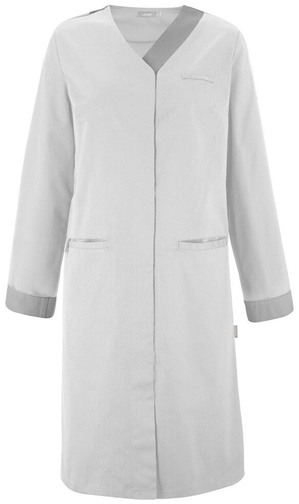Blouse femme. Fermeture milieu devant par boutons-pression cachés. Passant porte-badge côté gauche, 2 poches passepoilées dont une à 3 compartiments et un passant pendoir côté. Oeillets d'aération brodés sous les bras, manches longues retroussables avec bas de manches revers contrastés. Longueur : 100 cm.