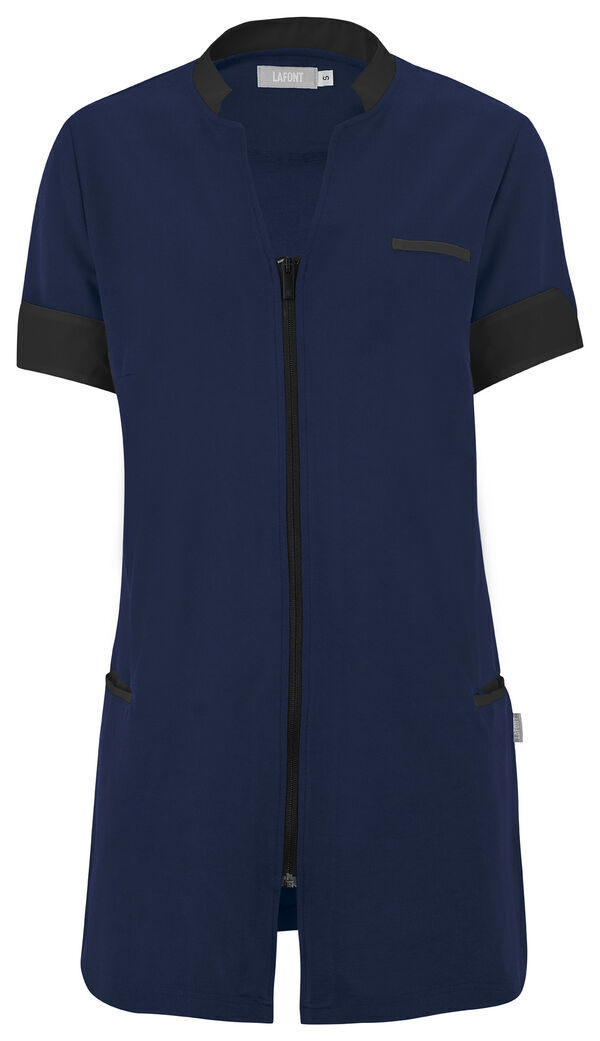 Tunique femme. Col biseauté, fermeture par zip milieu devant. 2 poches côtés et 1 passant pendoir côté droit. Hautes fentes côtés laissant apparaître le fond de poche contrasté. Œillets brodés d'aération sous les bras, manches courtes avec fente biseautée et bas de manches avec parement intérieur contrasté. Longueur : 75 cm.
