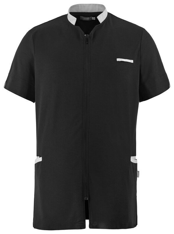 Tunique homme. Col biseauté, fermeture par zip milieu devant. 2 poches côtés et 1 passant pendoir côté droit. Hautes fentes côtés laissant apparaître le fond de poche contrasté. Œillets brodés d'aération sous les bras, manches courtes avec fente biseautée et bas de manches avec parement intérieur contrasté. Longueur : 75 cm.