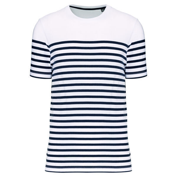 T-shirt homme à encolure ronde avec bord-côte 1x1. Manches courtes. Finition double aiguille bas de manches et bas de vêtement. Rayures tricotées. Coupe droite.