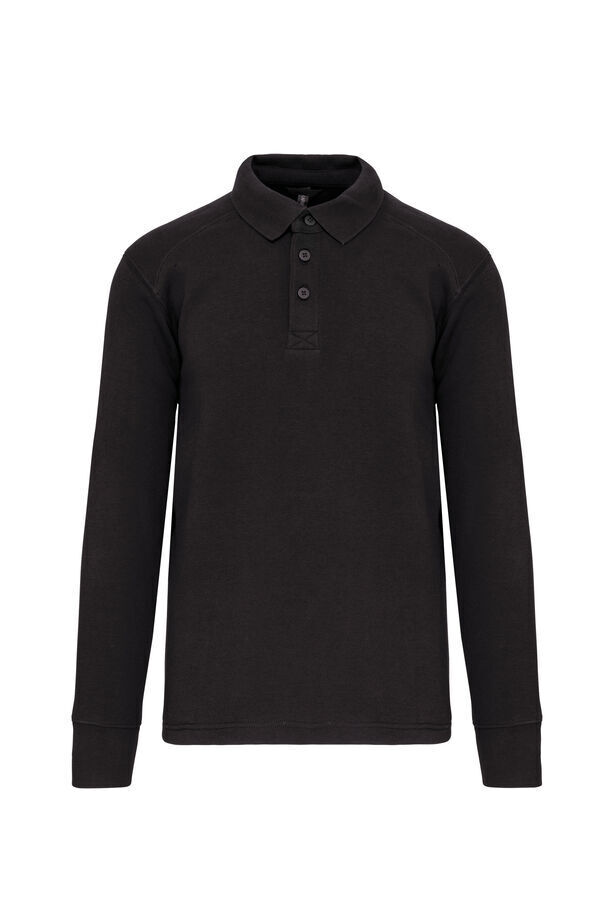 Sweat-shirt molleton à col polo. Patte de boutonnage col 3 boutons. Finition demi-lune. Renfort double matière aux épaules. Bas de manches en bord-côte. Passe-fil dans la poche et passant encolure pour écouteurs. Poche zippée invisible côté droit. Passant stylo sur manche. Finition double aiguille au bas du vêtement et dos rallongé. Polyester molleton en 3 fils avec traitement LSF.