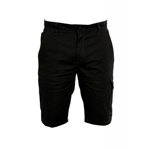 Bermuda stretch. Ceinture fermée par bouton et zip. Poches italiennes avec poche zippée côté droit au porter. Poche cuisse avec soufflet fermée par rabat avec auto-agrippant. Poche mètre. 2 poches arrière plaquées dont une fermée par rabat avec auto-agrippant. Renfort d'entrejambe. Triple surpiqûres à l'entrejambe. Rehausse dos. | Mercerie tout plastique. E.J. : 27 cm.