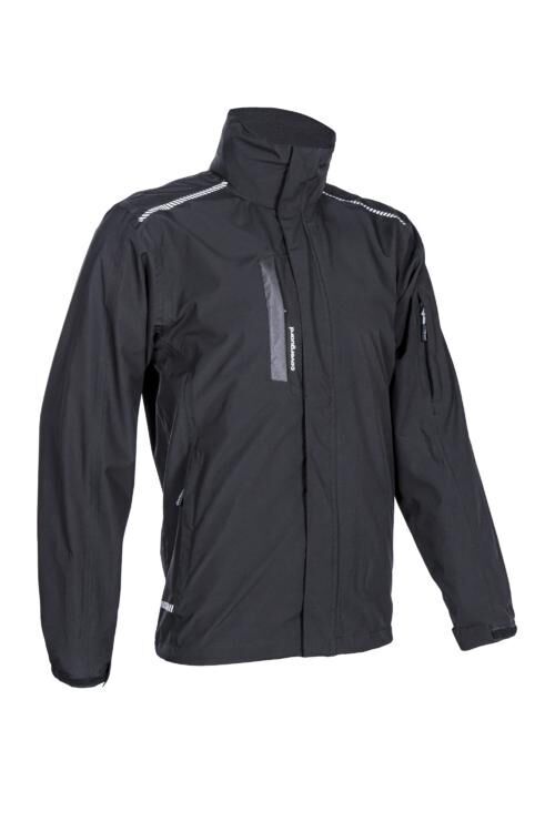 Coupe-vent imper-respirant. Col montant, fermeture zip central sous rabat, protège menton. Capuche tempête intégrée dans le col, réglable par bande auto-agrippante, cordon de serrage élastiqué et bloqueurs. Manches longues, poignets semi-élastiqués, patte de serrage. Poche poitrine, 2 poches basses, poche manche zippée sous passepoils. Poche plaquée intérieure zippée. Serrage bas réglable par cordon élastique. | Stretch mécanique. Coutures étanchées. Trappe de marquage. Coupe ajustée. Imperméabilité 8 000 mm. Respirabilité 5 000 g/m²/24h.