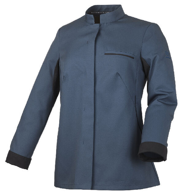 Veste femme à col officier, biais de propreté Seaqual® à l’encolure. Fermeture milieu devant par bouton-pression cachés. Poche poitrine côté gauche. Découpes côtés avec un liseré de couleur. Manches longues finies par poignets et broderie. Empiècement maille sous les bras.