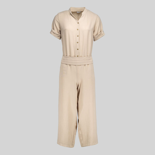 03GARCOMBBAMBULA Combinaison femme, coupe courte. Col V. Fermeture centrale 6 boutons pressions. 2 poches italiennes. Ceinture à nouer à la taille. Manches courtes. Pinces poitrine et arrière. Jambes amples.